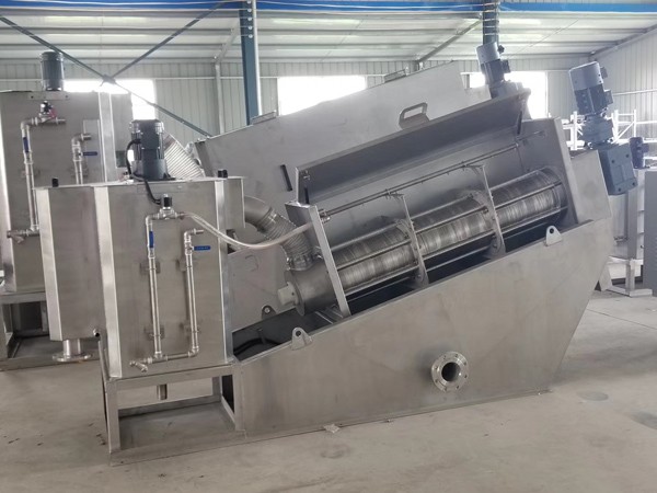 設(shè)備前端為濃縮段,后端為脫水段。污泥在濃縮段經(jīng)重力脫水后,被運(yùn)輸?shù)矫撍?,在前進(jìn)過(guò)程中隨著慮縫及螺距的逐漸變小,以及背壓板的作用下,產(chǎn)生極大的內(nèi)壓,容積不斷縮小,達(dá)到充分脫水的目的,